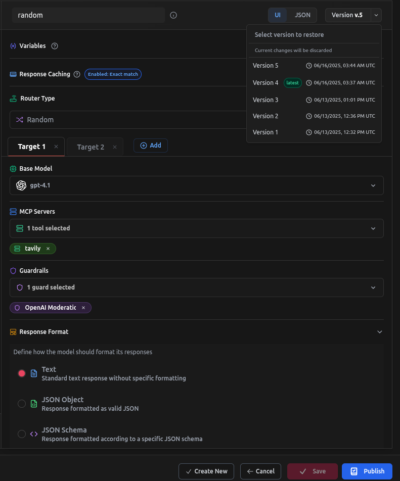 To preview changes in a draft or restored draft, switch the UI or JSON view selector to that draft and experiment in the Virtual Model Editor — all without impacting production calls.
