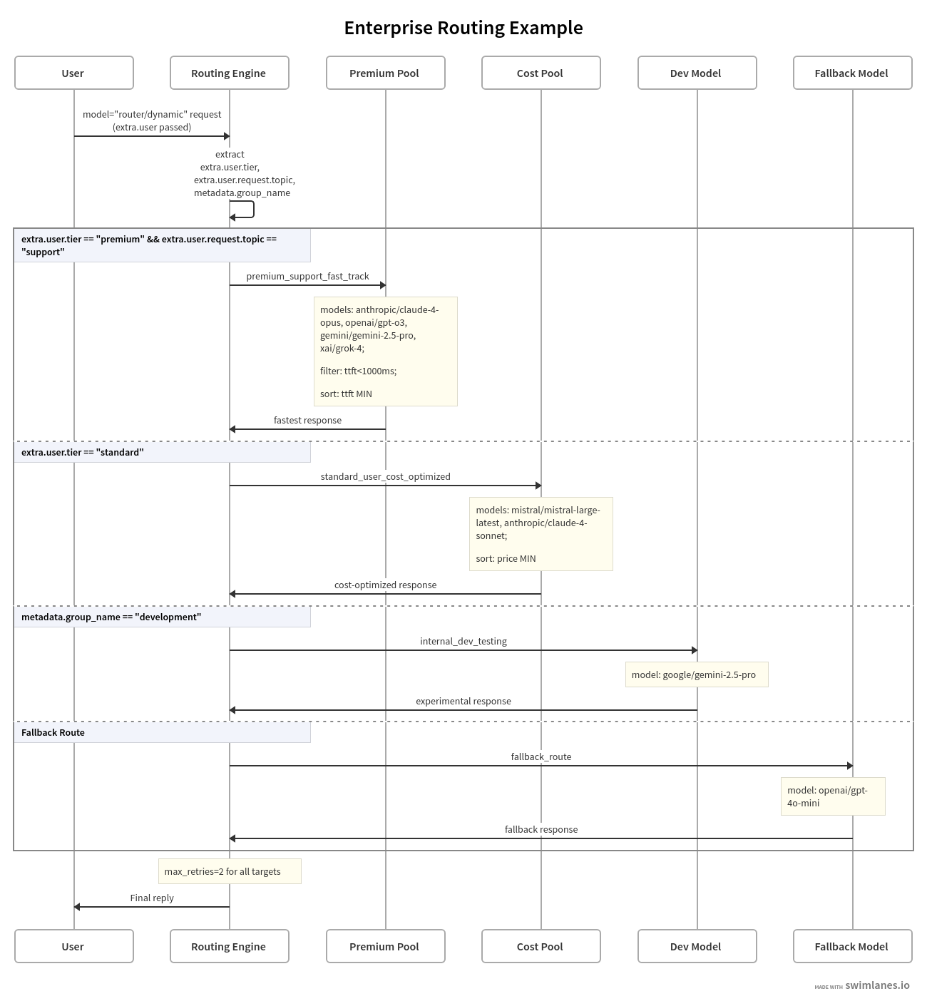 This example demonstrates a multi-layered routing strategy for a SaaS company that balances performance for premium users, cost for standard users, and flexibility for internal development.