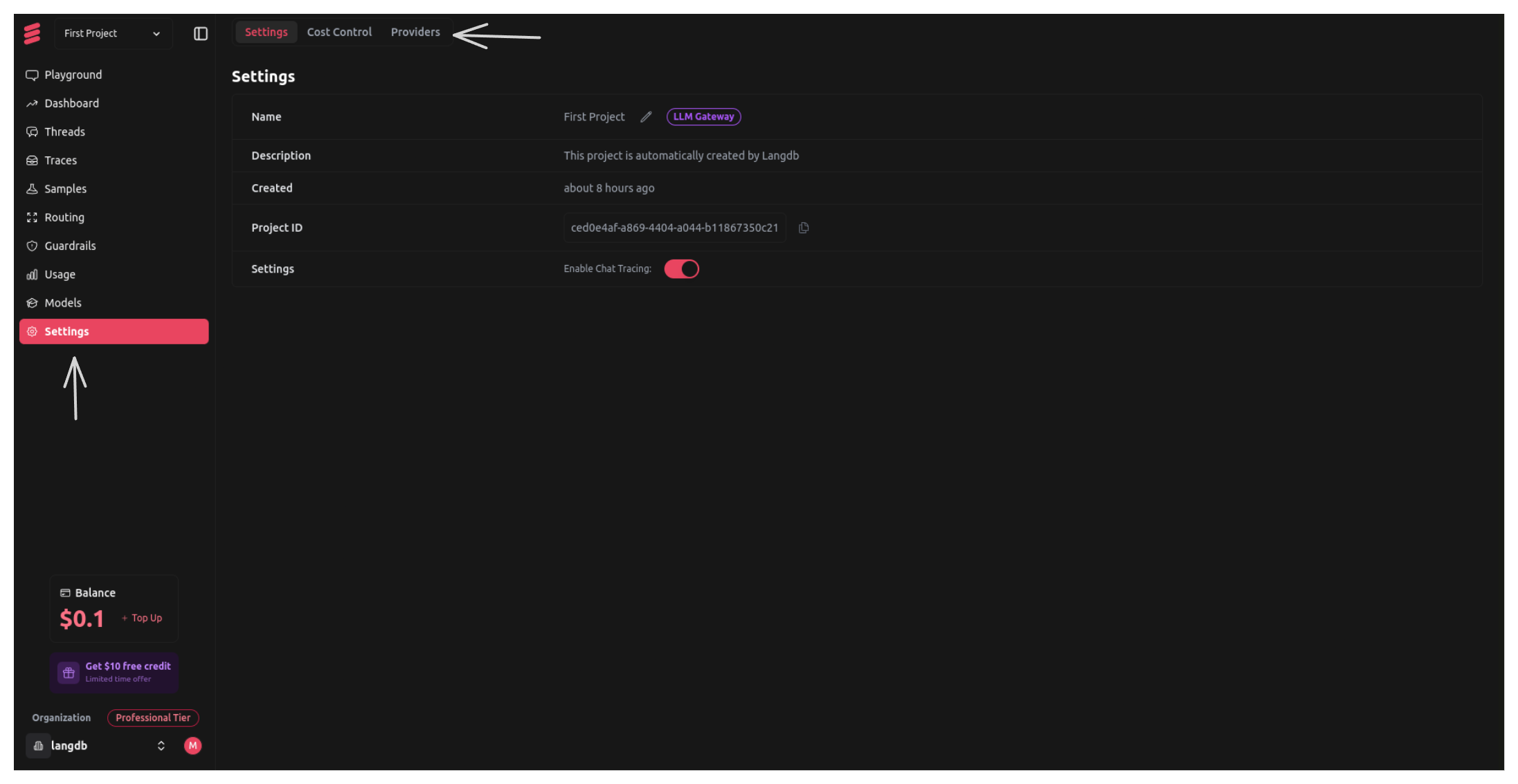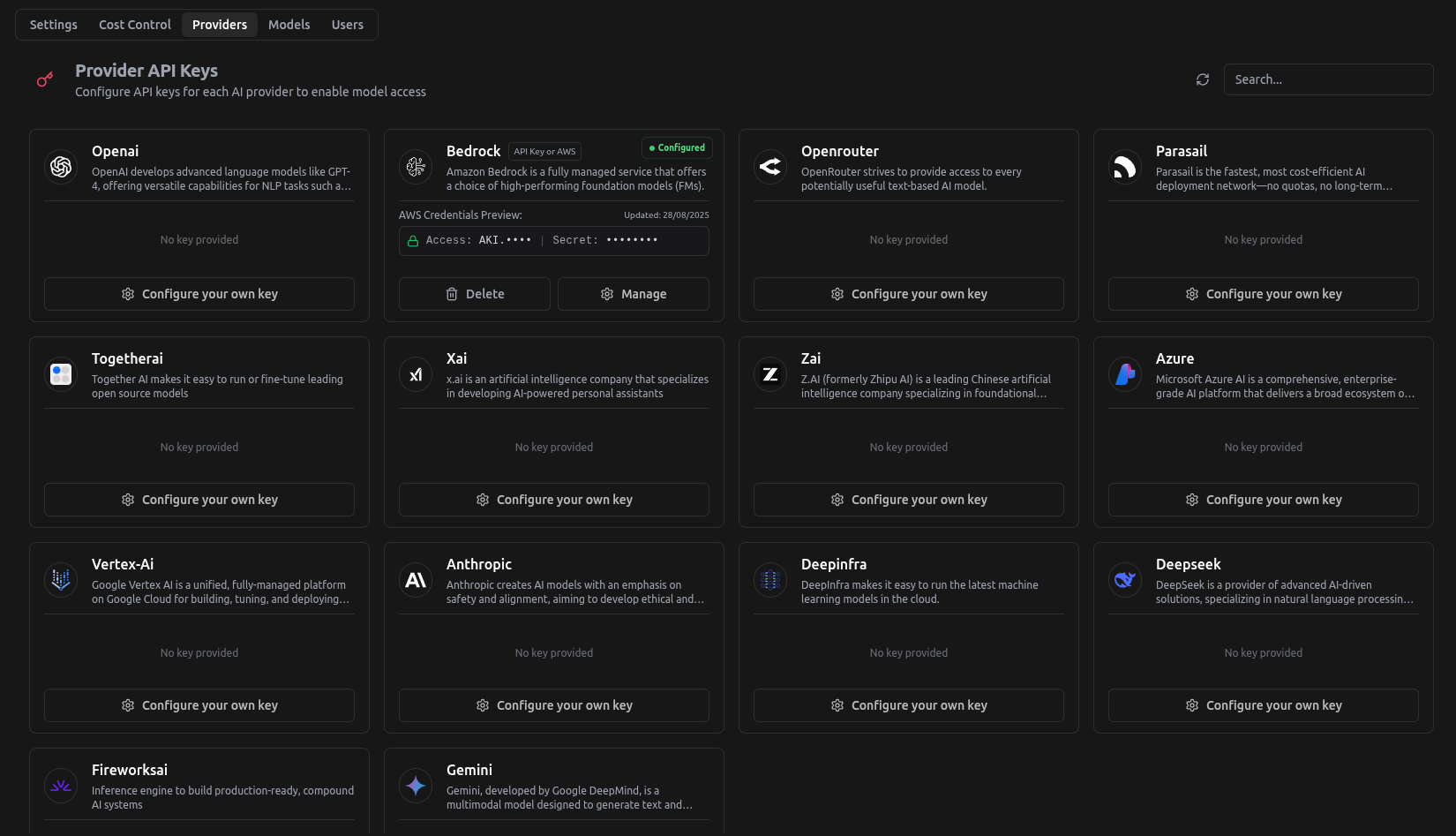 LangDB supports bringing your own provider API keys (BYOK) to give you direct control over rate limits and costs via your provider account.