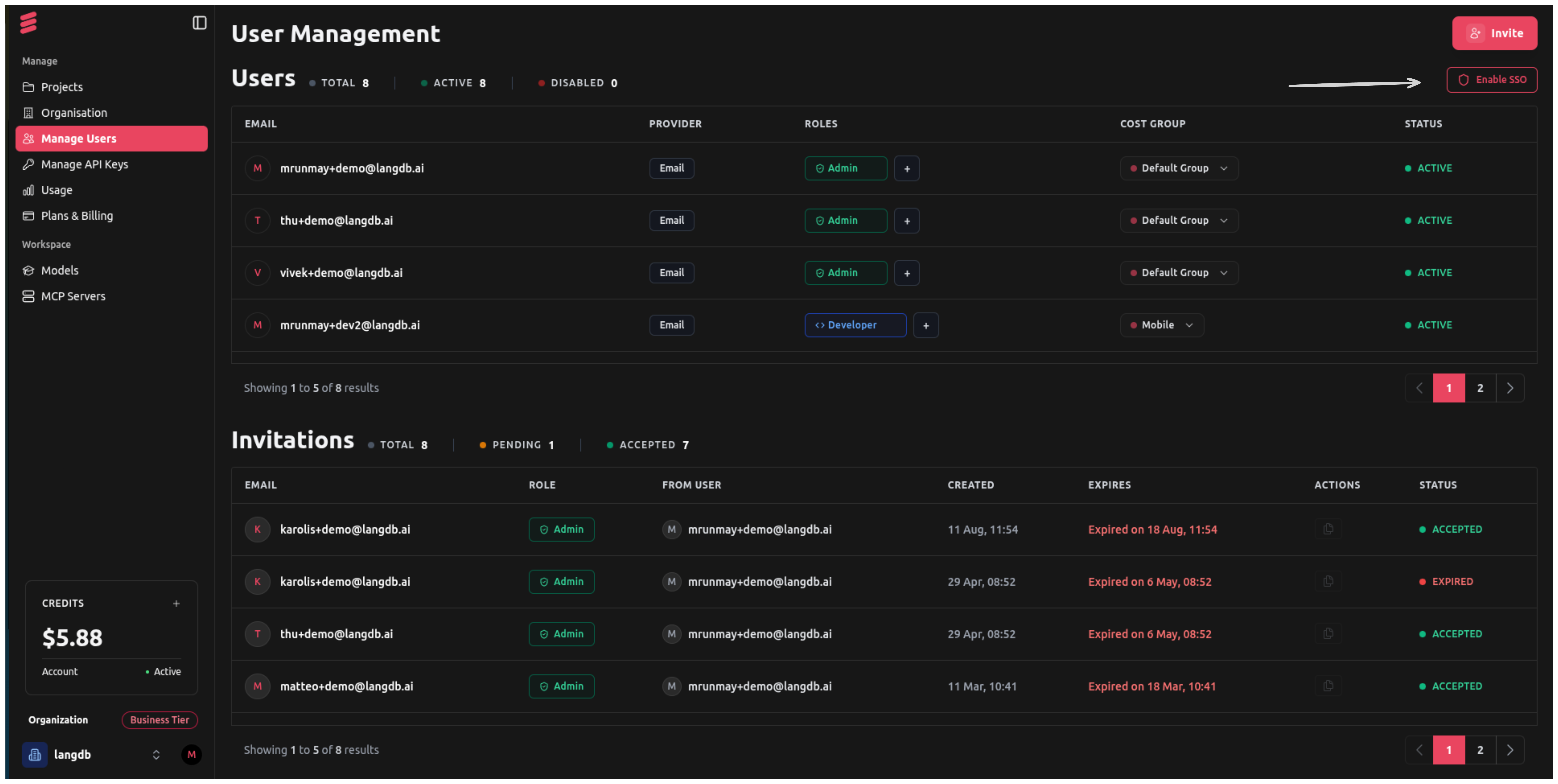On the User Management page, locate the "Enable SSO" checkbox in the top right corner, positioned below the red "& Invite" button. This setting controls whether SSO is enabled for your organization.