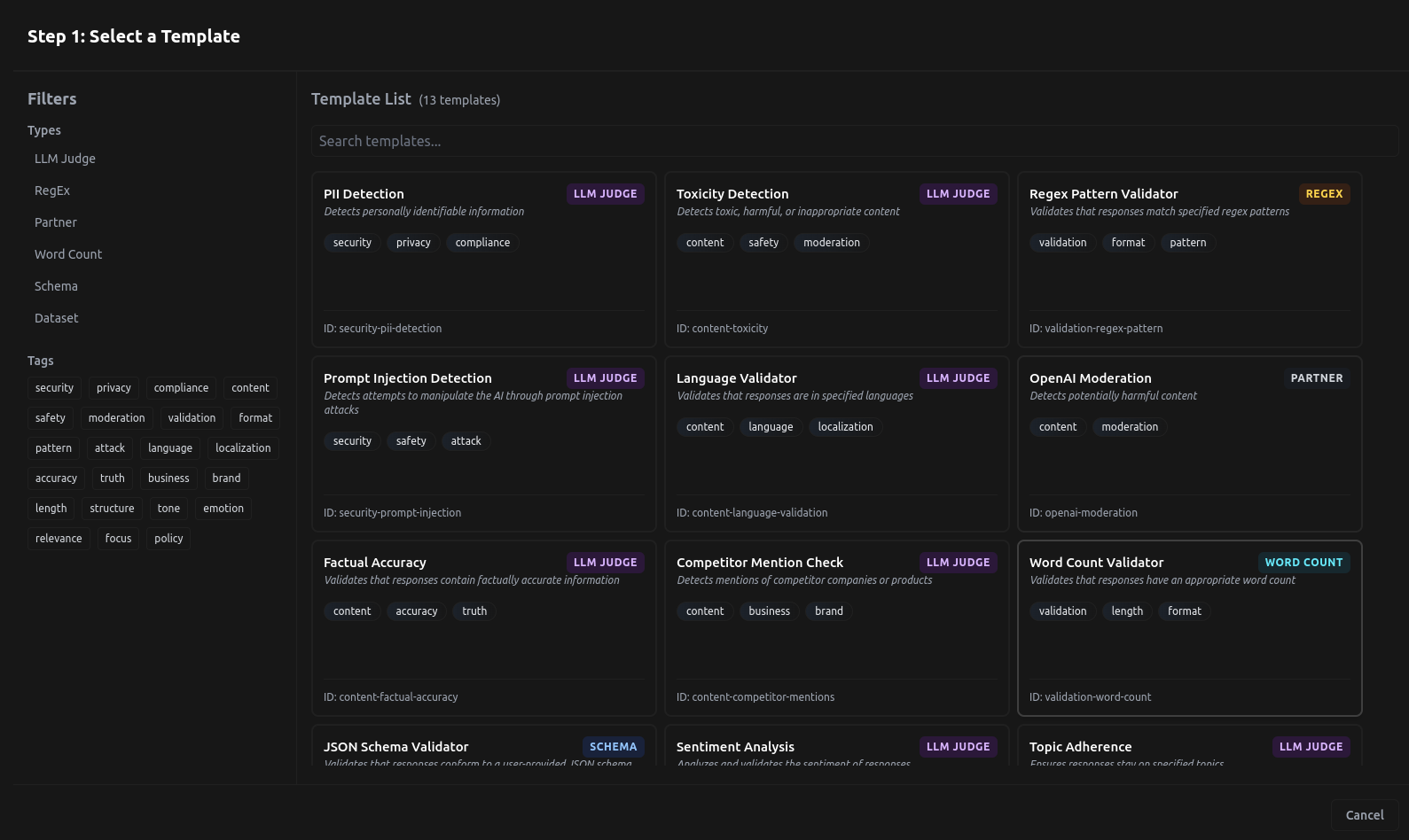 - Response Validation: Validates response format and structure (e.g., word count, JSON schema, regex patterns).