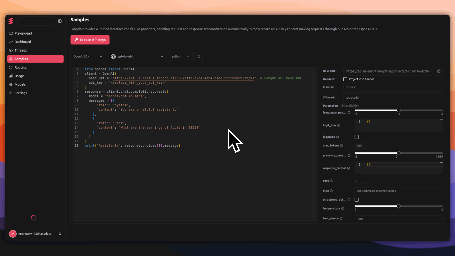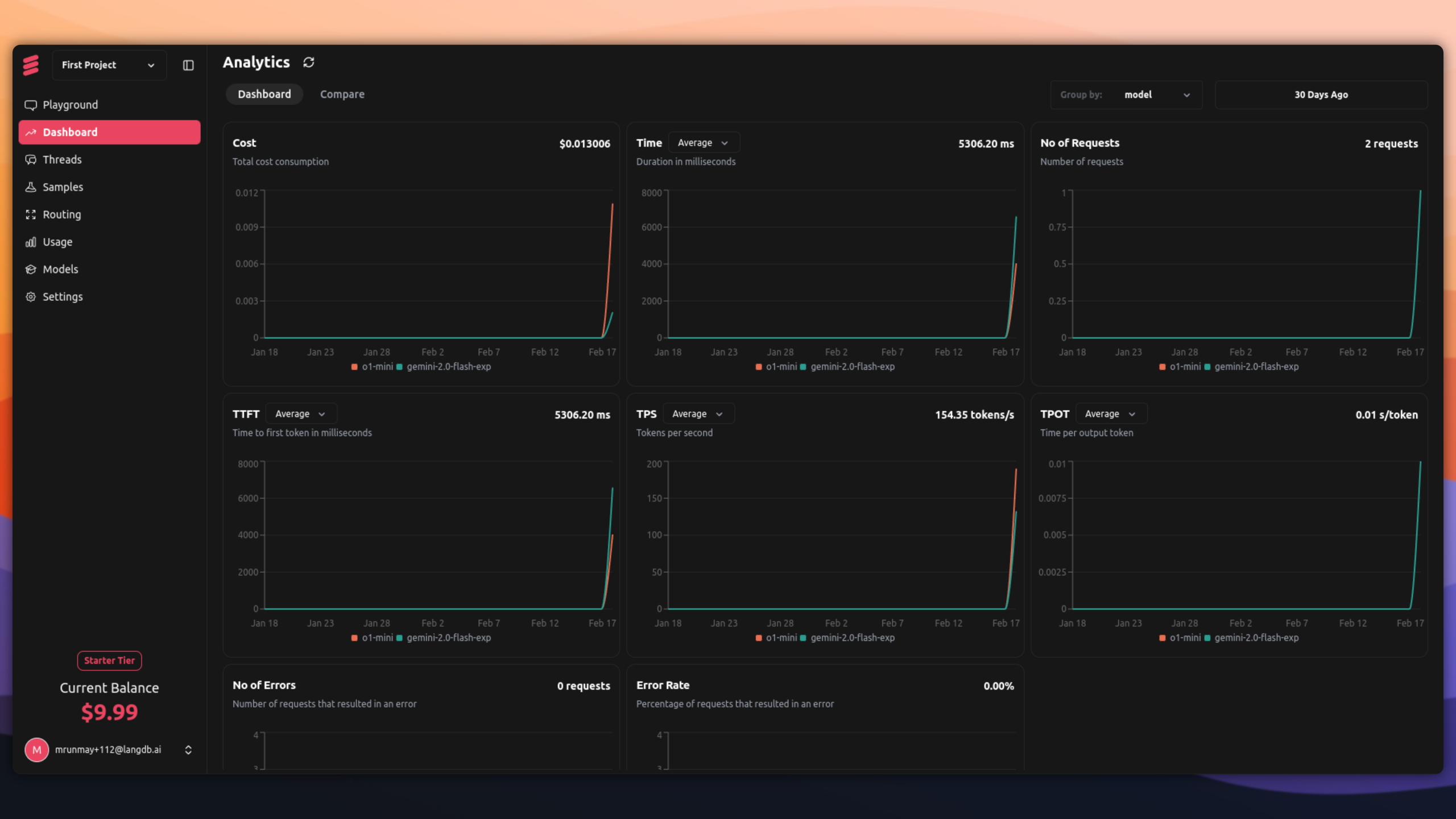 Monitor usage, costs, and performance insights through the LangDB analytics dashboard.