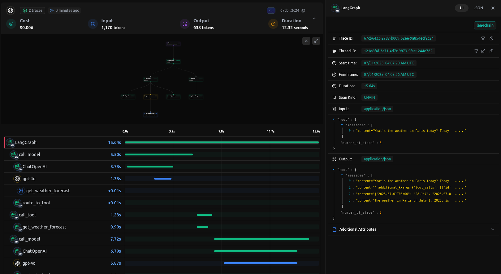 {'messages': [AIMessage(content="The weather in Paris on July 1, 2025, is as follows:\n\n- 00:00: 28.1°C\n- 01:00: 27.0°C\n- 02:00: 26.3°C\n- 03:00: 25.7°C\n- 04:00: 25.1°C\n- 05:00: 24.9°C\n- 06:00: 25.8°C\n- 07:00: 27.6°C\n- 08:00: 29.6°C\n- 09:00: 31.7°C\n- 10:00: 33.7°C\n- 11:00: 35.1°C\n- 12:00: 36.3°C\n- 13:00: 37.3°C\n- 14:00: 38.6°C\n- 15:00: 37.9°C\n- 16:00: 38.1°C\n- 17:00: 37.8°C\n- 18:00: 37.3°C\n- 19:00: 35.3°C\n- 20:00: 33.2°C\n- 21:00: 30.8°C\n- 22:00: 28.7°C\n- 23:00: 27.3°C\n\nIt looks like it's going to be a hot day in Paris!", additional_kwargs={'refusal': None}, response_metadata={'token_usage': {'completion_tokens': 319, 'prompt_tokens': 585, 'total_tokens': 904, 'completion_tokens_details': None, 'prompt_tokens_details': None, 'cost': 0.005582999999999999}, 'model_name': 'gpt-4o', 'system_fingerprint': None, 'id': '3bbde343-79e3-4d8f-bd97-b07179ee92c0', 'service_tier': None, 'finish_reason': 'stop', 'logprobs': None}, id='run--4fd3896d-1fbd-4c91-9c21-bd6cf3d2949e-0', usage_metadata={'input_tokens': 585, 'output_tokens': 319, 'total_tokens': 904, 'input_token_details': {}, 'output_token_details': {}})], 'number_of_steps': 2}